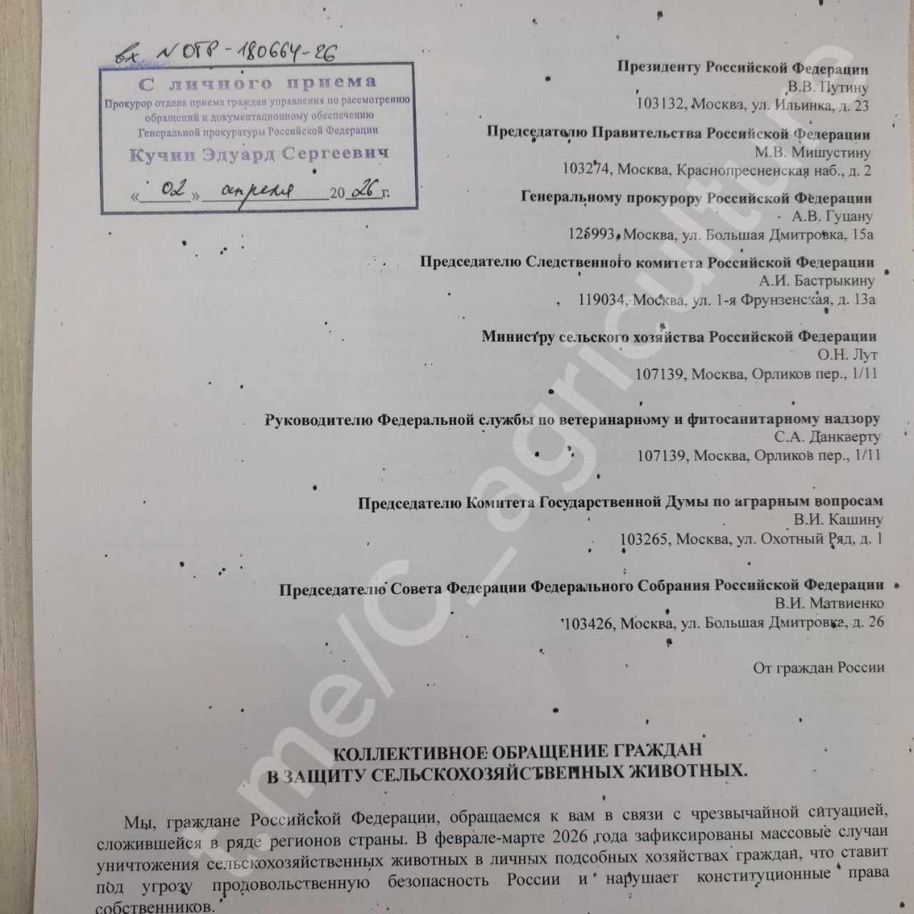 В Москве Всероссийский Аграрный Совет продолжает подачи Коллективного требования в защиту с/х животных.Под обращением собрано более 31000 подписей. Во вторник - 31.03.2026 - Требования подали в Администрацию президента, Госдуму, Совет Федерации, Правительство РФ, Минсельхоз, Федеральную службу по ветеринарному и фитосанитарному надзору.